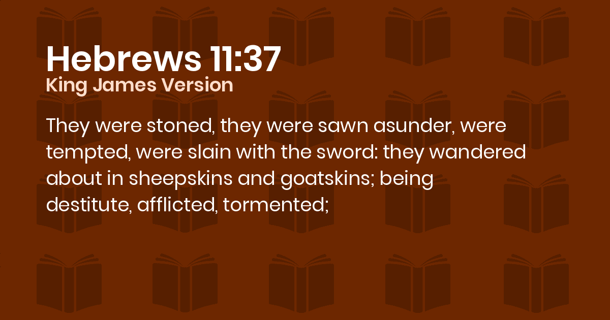 02/10/2020 · hebrews 11:37 they were stoned, they were sawn in two, they were tempted, they were put to death * * with the sword;.. They were stoned, they were sawed in two, they died by the sword, they wandered about in sheepskins, in goatskins, destitute, afflicted, and mistreated. what does hebrews 11:37 mean?